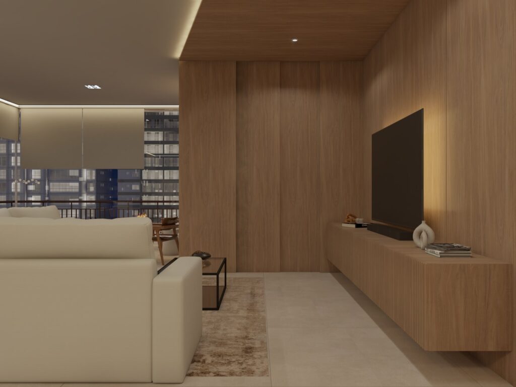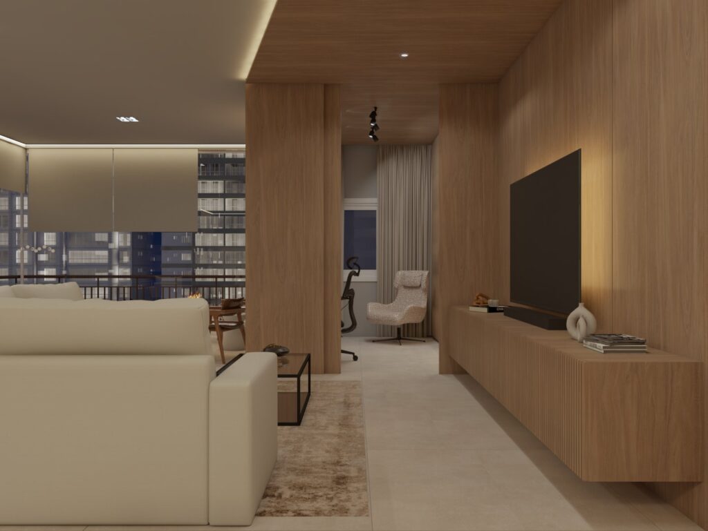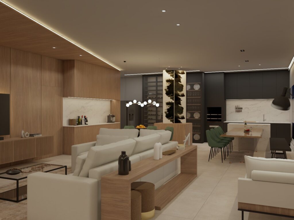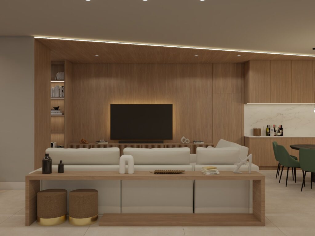 A escolha por materiais de alta qualidade como revestimentos naturais, texturas nobres e soluções personalizadas garante durabilidade, elegância e uma estética atemporal. A paleta suave, aliada à iluminação bem planejada, reforça a sensação de amplitude e conforto, valorizando cada espaço e destacando pontos de interesse arquitetônico.