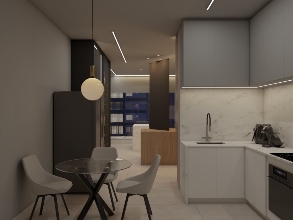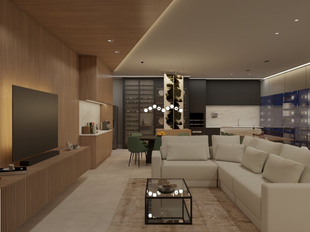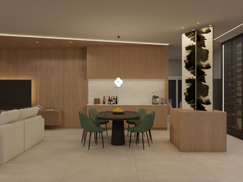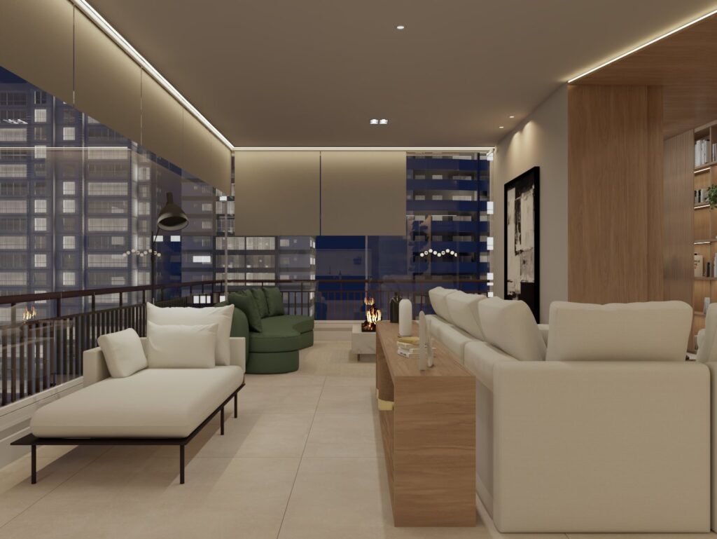 A escolha por materiais de alta qualidade como revestimentos naturais, texturas nobres e soluções personalizadas garante durabilidade, elegância e uma estética atemporal. A paleta suave, aliada à iluminação bem planejada, reforça a sensação de amplitude e conforto, valorizando cada espaço e destacando pontos de interesse arquitetônico.
